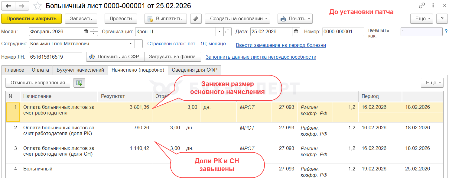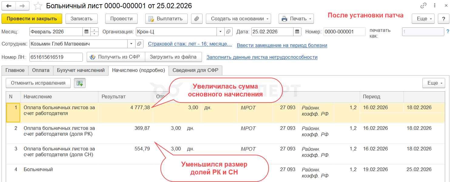 После установки патча средний заработок РК и СН для больничных больше не включает отменные доли РК и СН с оплат по среднему 2025 года.